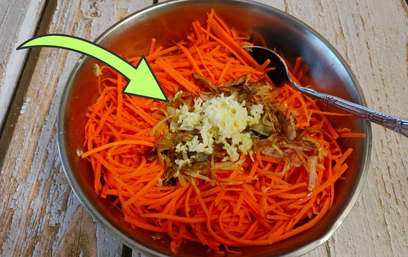 До моркви додайте всі спеції та часник, пропущений через прес.