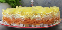 Викладайте шарами: ананас → курка → морква → яйця → кукурудза → сир → капуста.