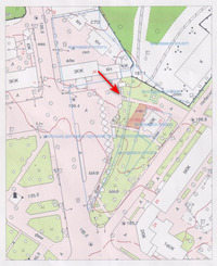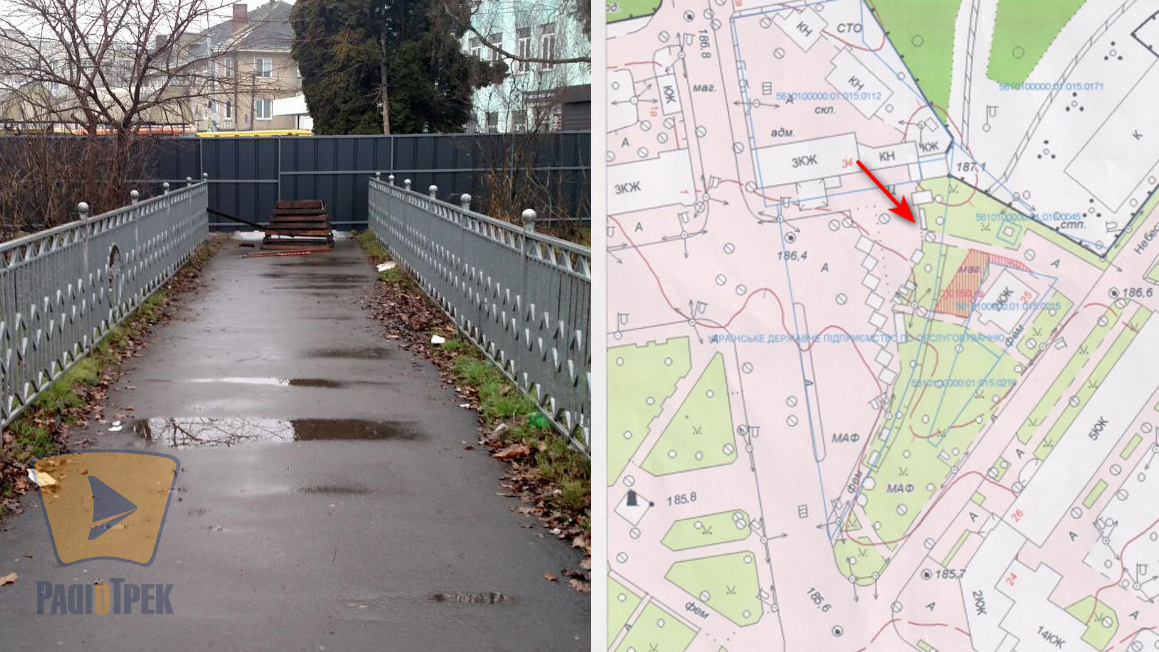 На проєкті ця земля позначена червоним, а стрілкою вказаний прохід, який нещодавно там перекрили і встановили нову огорожу.